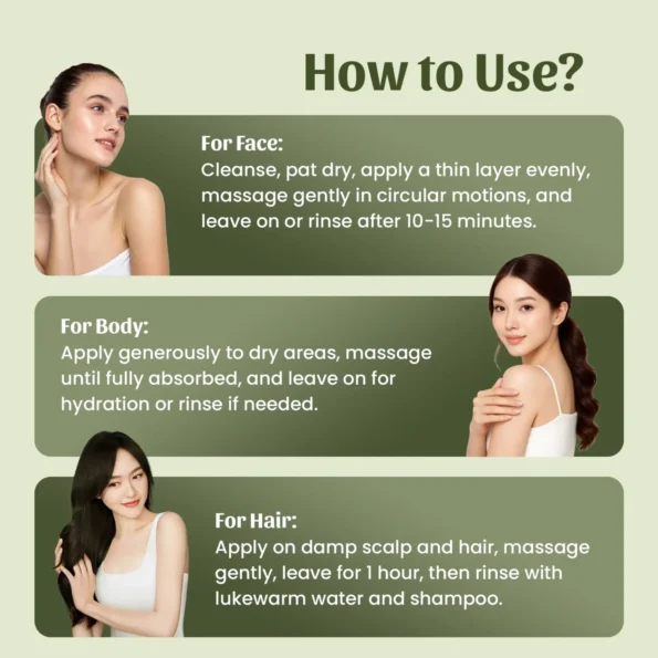 Pour les cheveux : Appliquer sur le cuir chevelu et les cheveux humides en massant délicatement. Laisser poser environ 1 heure, puis rincer à l’eau tiède et au shampoing pour un résultat optimal.